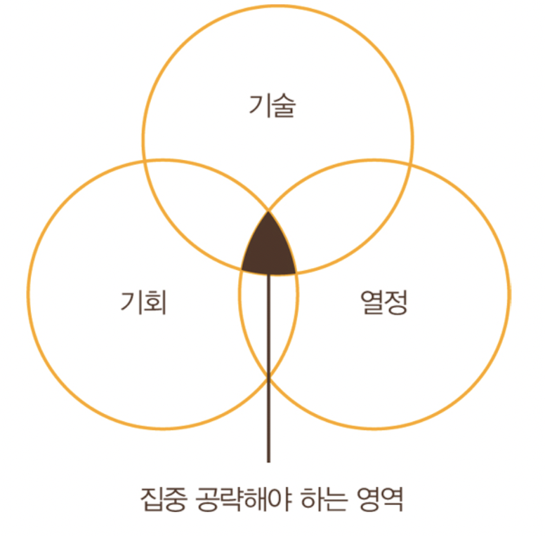 짐 콜린스는 <좋은 기업을 넘어 위대한 기업으로>에서 '고슴도치 개념'을 소개하면서 세 개의 원이 교차하는 영역에 대해 설명한다. 세 개의 원이 교차하는 교집합 영역은 성공하는 기업이 되기 위해 노력을 집중 투자해야 할 영역이다.