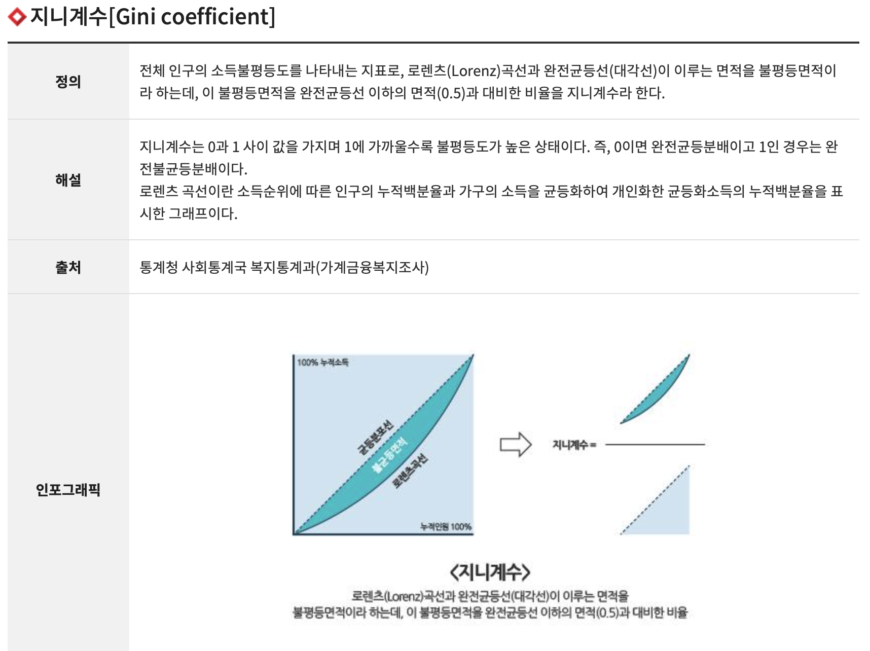 지니계수는 1에 가까울수록 불평등, 0에 가까울수록 평등이다.