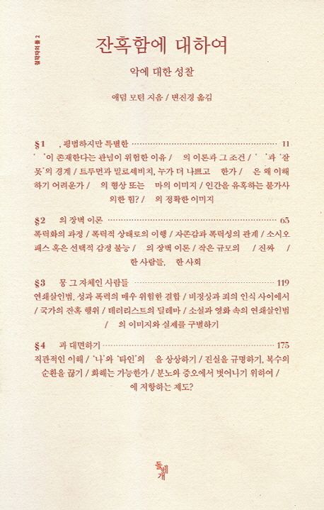 이런 모든 경우, 그리고 이상의 훨씬 더 많은 경우들이 우리 내부에서 어떤 상상력의 나태함을 불러일으킨다. 우리는 전형적인 공포, 허구적인 악당, 극심한 사악함의 면에서 악을 이해하는 편을 선호한다.