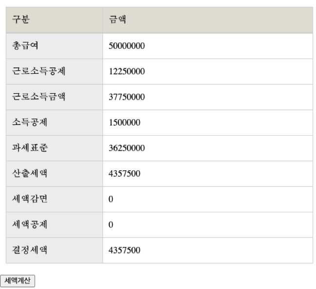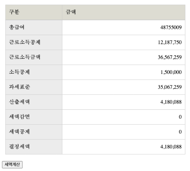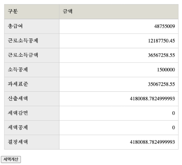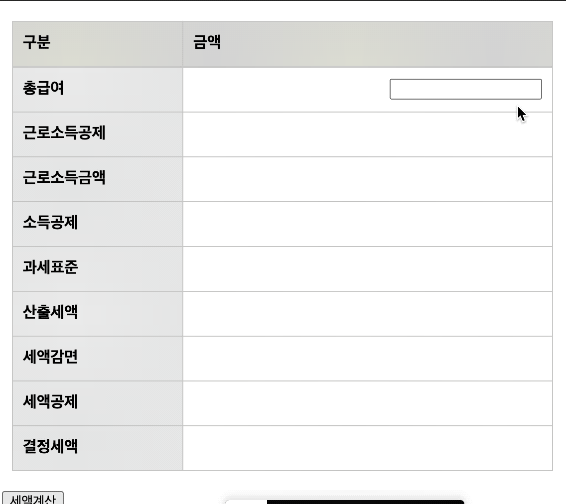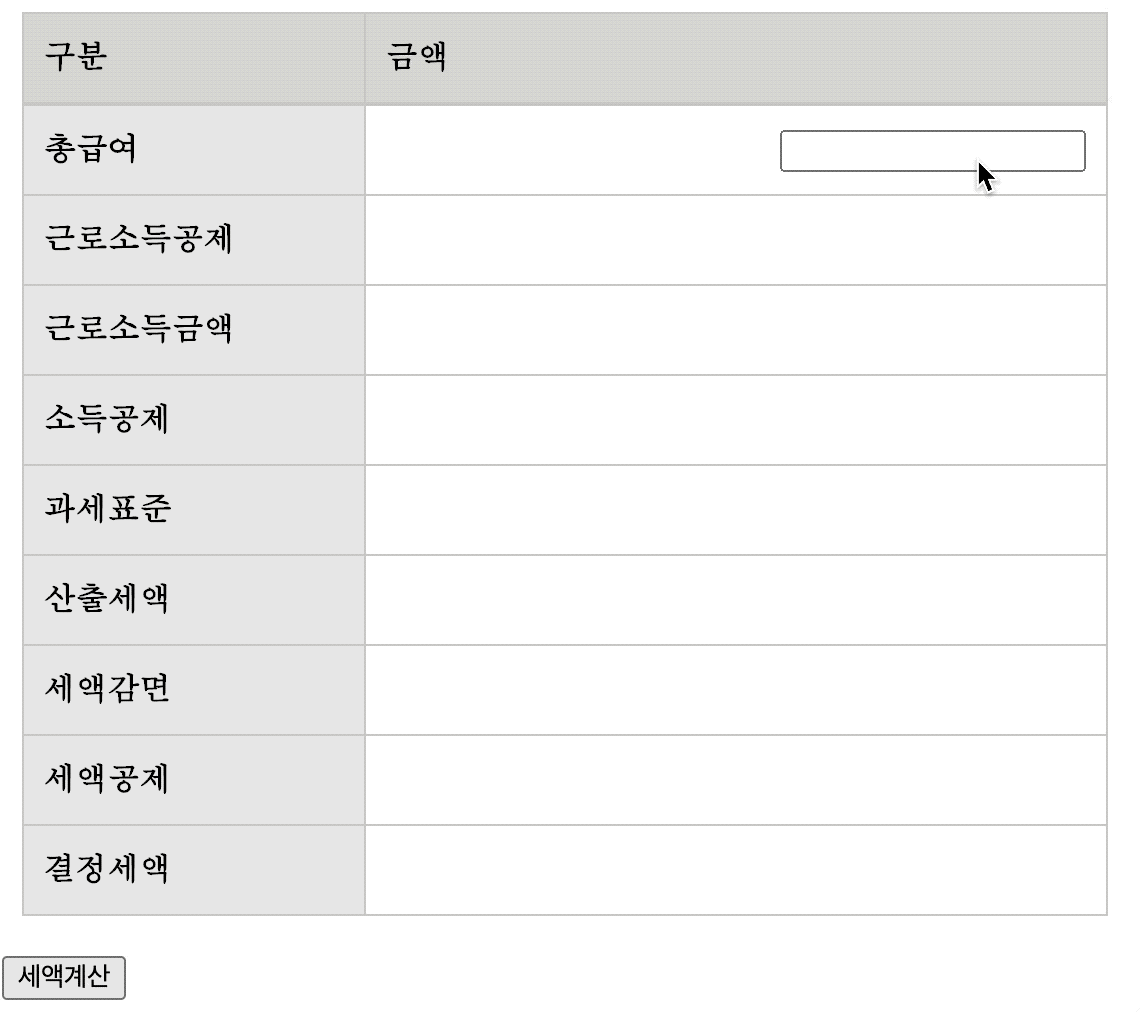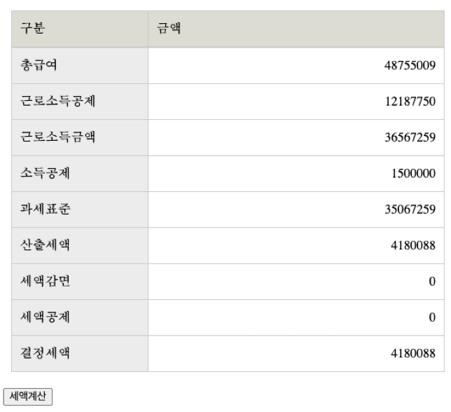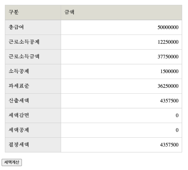 작동시켜 보려면 아래 result 부분에서 총급여를 입력하고 세액 계산 버튼을 눌러 보면 된다