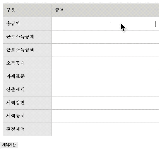 이 부분은 “총급여”라는 id가 부여된 HTML <td>태그를 가져온다. 그런데 값을 받아야 하는 input 태그에는 아무 아이디도 없고, 사실은 <td>의 아이디가 아니라 사용자가 값을 입력하는 <input> 태그에 아이디를 부여한 후 계산해야 한다.