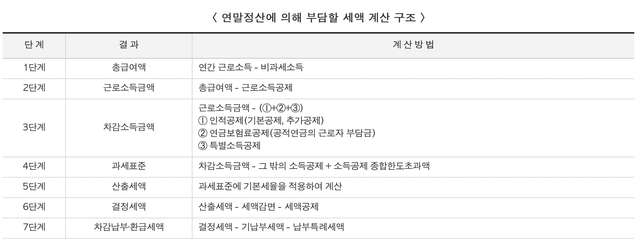 근로소득자의 세액 계산 구조를 살펴보면 아래와 같다. 계산과정이 많다. 아마 작년에 세금 얼마 냈는지 모르는 사람도 많을거 같다(나도 잘 모름)