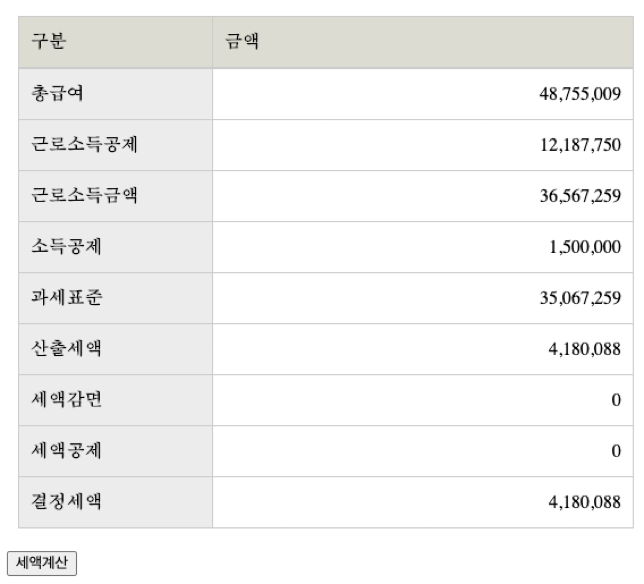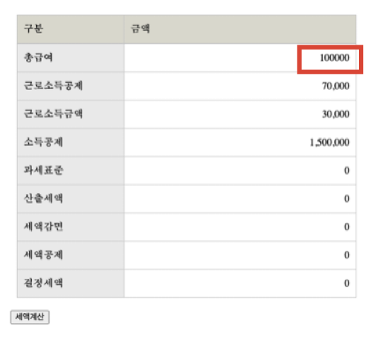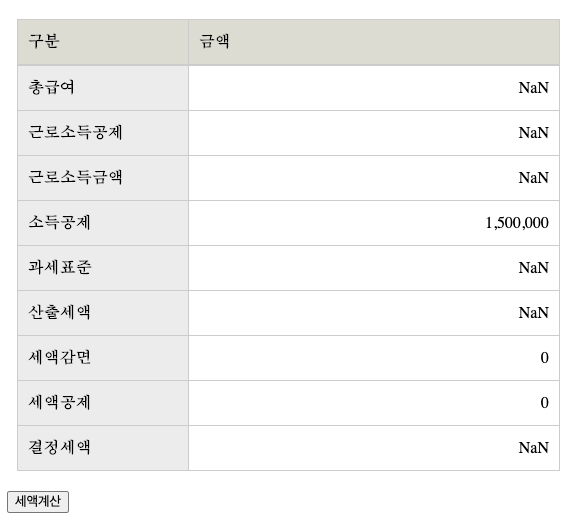 한번 계산하고 나면 아래처럼 총급여 부분을 다시 입력할 수 없게 되고, 새로고침을 해야만 다시 계산해 볼 수 있다. 이런 점도 고쳐야한다.