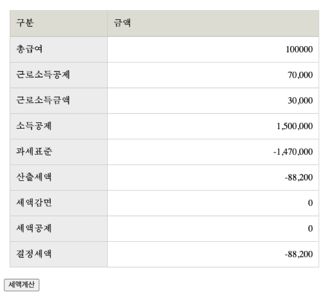 세액계산이 불완전한 것은 둘째치고 각종 오류들이 많다. 우선, 소득이 150만원 이라이면 과세표준과 세액이 음수로 나오는 문제가 있다.