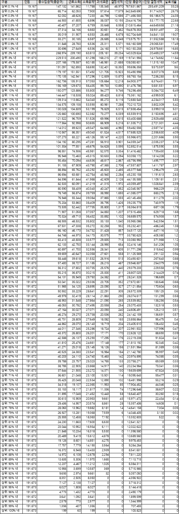 이를 가공하여 아래와 같은 결과 하에서, 근로소득자 중 백분위와 결정세액, 실효세율을 계산하는 코드를 작성했다.