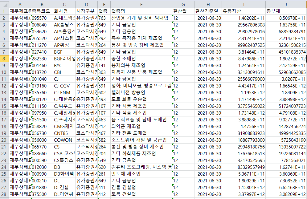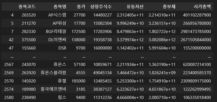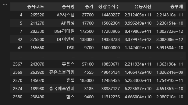 데이터 전처리 해서, 종목코드, 회사명, 유동자산, 총부채만 남겨둔다.