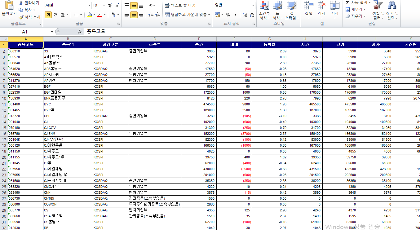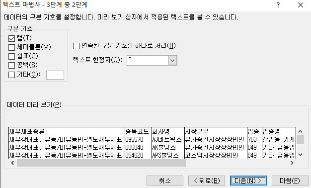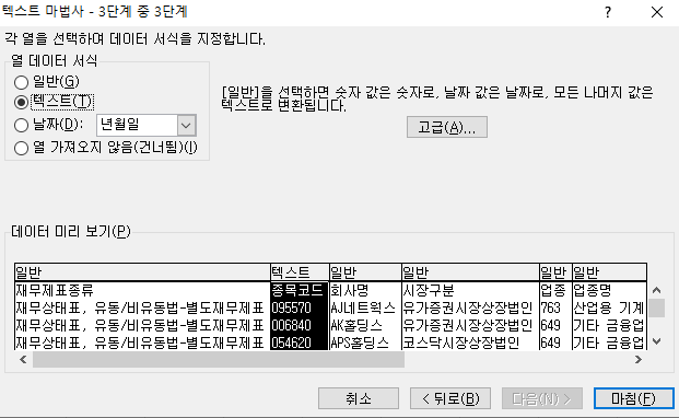 아래에서 "종목코드" 열은 텍스트로 지정해 준다.