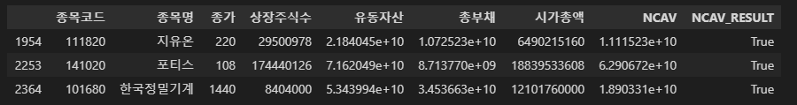 corp_total_dropna["NCAV_RESULT"] = corp_total_dropna["NCAV"] > corp_total_dropna["시가총액"]*1.5