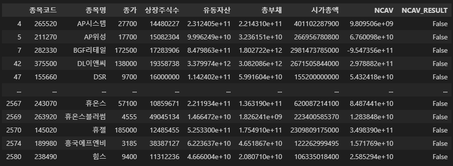 1배가 아니라 1.5배를 적용하는 이유는 안전마진 확보 차원이다. NCAV_RESULT 라는 열이 추가된다.