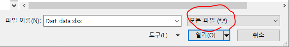 아래 빨간 동그라미 친 부분에 원래 "모든 엑셀 파일"로 되어 있을 텐데