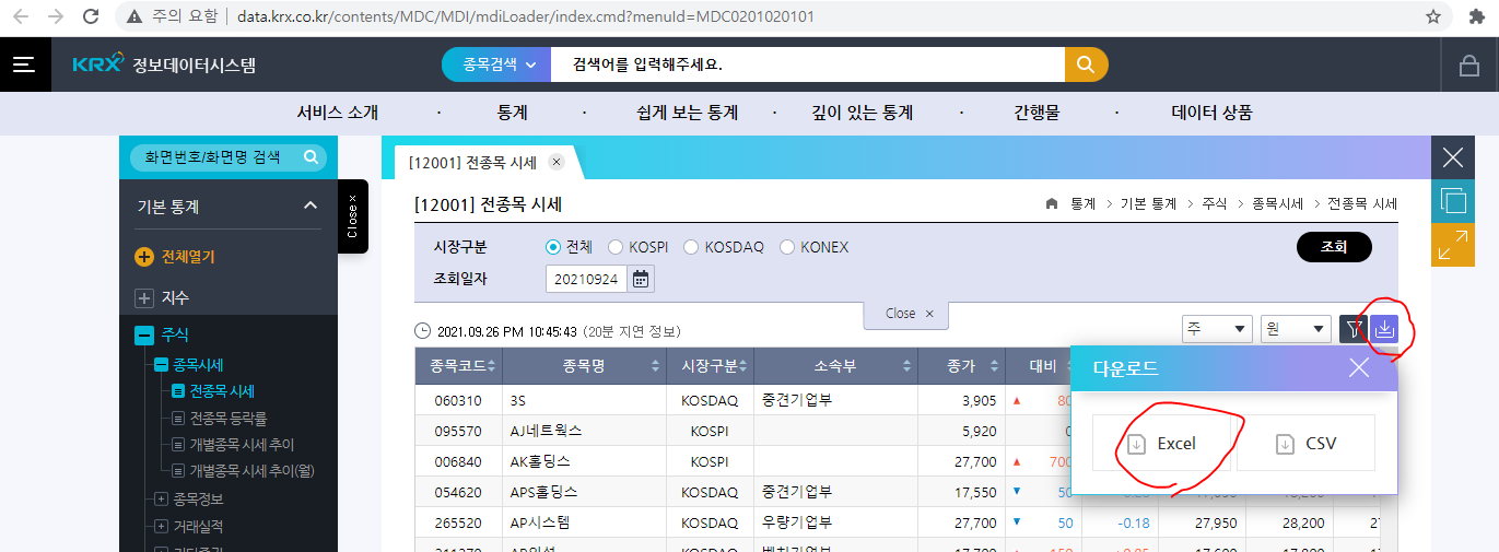엑셀 다운로드를 선택한다. 파일명은 KRX_data.xlsx로 하였다.