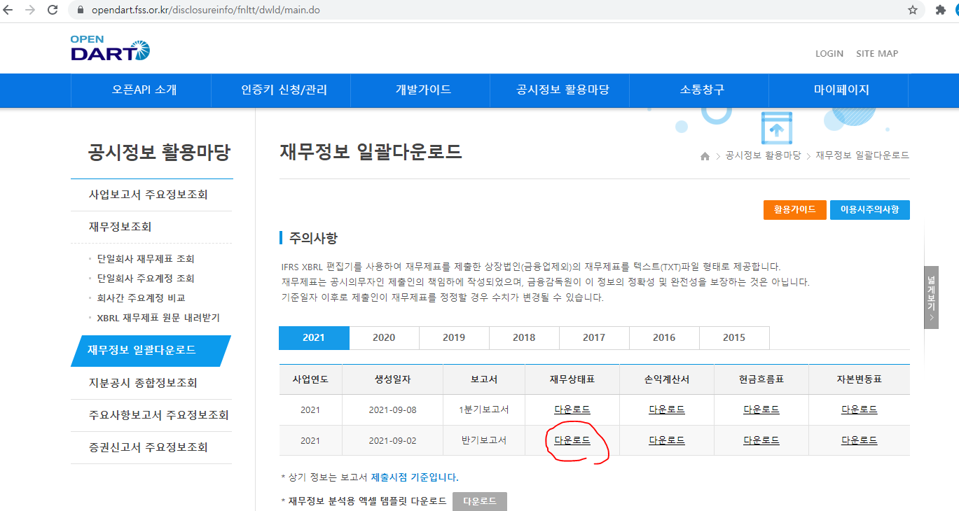 opendart 사이트에서 재무정보 일괄 다운로드 서비스를 제공하고 있다.