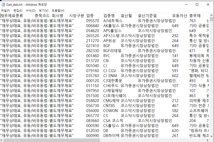 (1) Dart_data.txt (회사별 유동자산, 총부채) -> 가공 후 엑셀로 저장