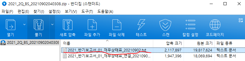 재무상태표의 유동자산, 총부채 정보만 있으면 되니 재무상태표만 다운로드한다.