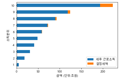 이 자료를 바탕으로 각 근로소득 분위별 세후 근로소득과 세부담율을 확인해 보았다.