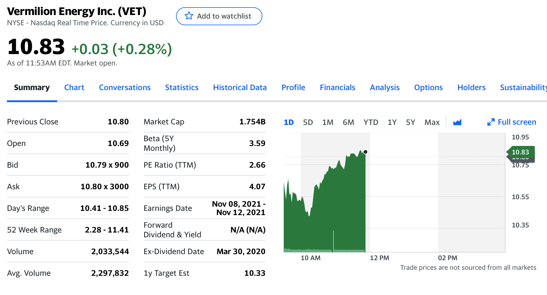 글을 쓰는 21년10월 8일 현재 국제유가는 80달러 선, 버밀리온에너지의 주가는 10달러 선이다. 그래프에 비추어 봤을 때, 유가 상승이 유지된다면 주가 상승을 기대해 볼 수도 있을 것으로 보인다.